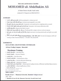 ابحث عن فرصة عمل ك كاشير "أو" مدخل بيانات "امتلك خبرة عملية سابقة ككاشير، مما منحني الدقة والسرعة في التعامل مع الحسابات اليومية، بالاضافة لخبرتي المباشرة في ادخال البيانات وخدمة العملاء