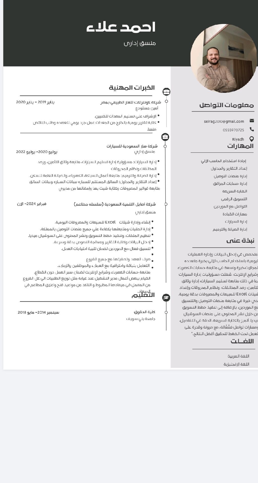 منسق اداري خبرة داخل المملكة خبرة في إدارة التشغيل اليومي، اعداد تقارير وExcel، متابعة الطلبات ومنصات التوصيل، والتعامل مع الموردين خبرة في متابعة المصروفات وتنظيم العمليات وتحسين سير العمل متواجد في الرياض - متاح للعمل فورا