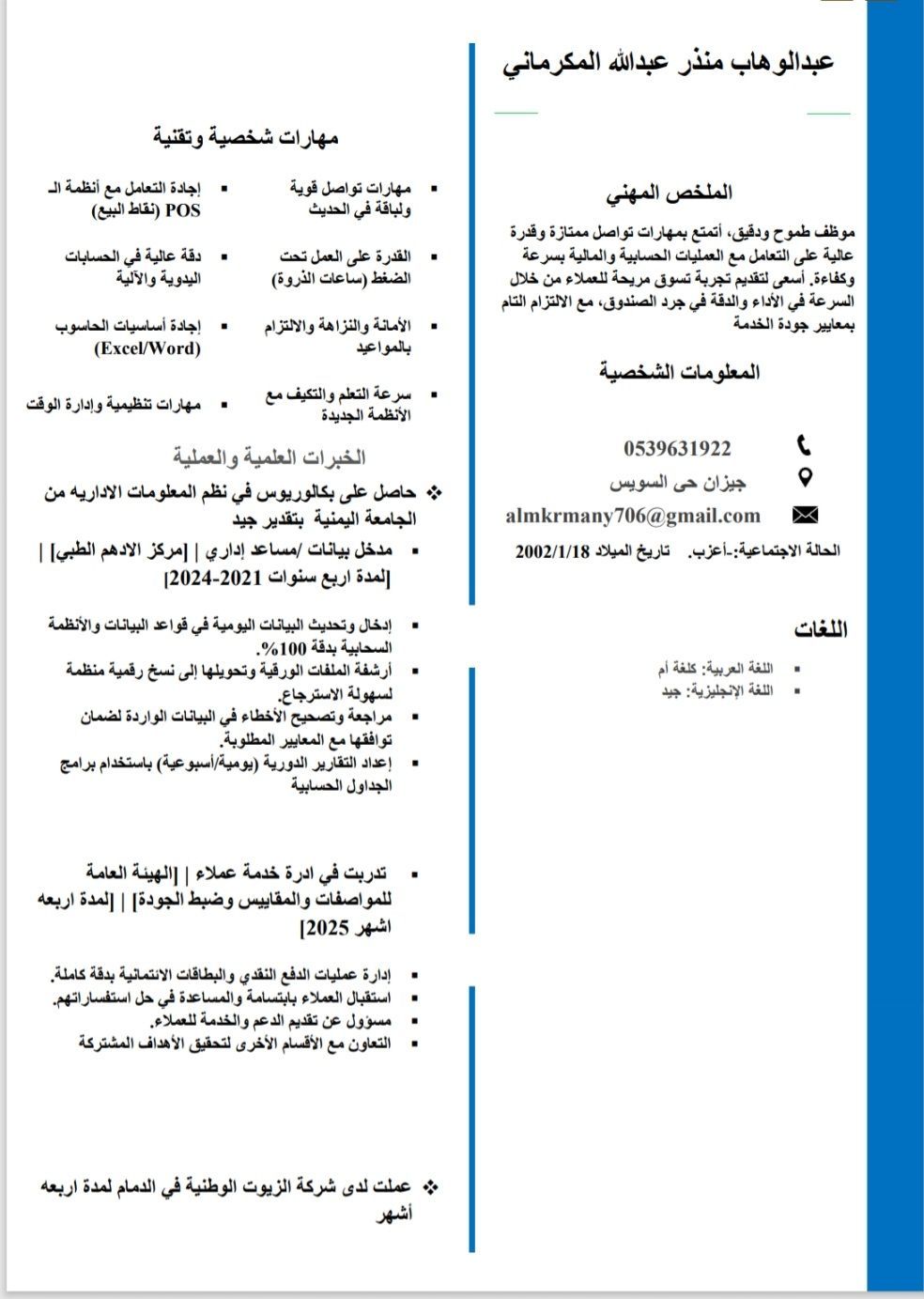 خريج بكلوريوس تخصص نظم معلومات ادارية، وابحث عن فرصة عمل مناسبة في مجال الإدارة، ادخال بيانات، تحليل البيانات، تشغيل الأنظمة، الدعم التقني أو التنسيق الاداري. المبيعات، مخازن. لدي رغبة قوية في تطوير مهاراتي والمساهمة بفعالية في بيئة عمل احترافية، وأتطلع لفرصة أقدم فيها قيمة حقيقية وأطور خبرتي العملية. أقامه سارية المفعول سنة. ورخصة قيادة سيارة خاصه. أتشرف بالنظر في أي فرصة مناسبة