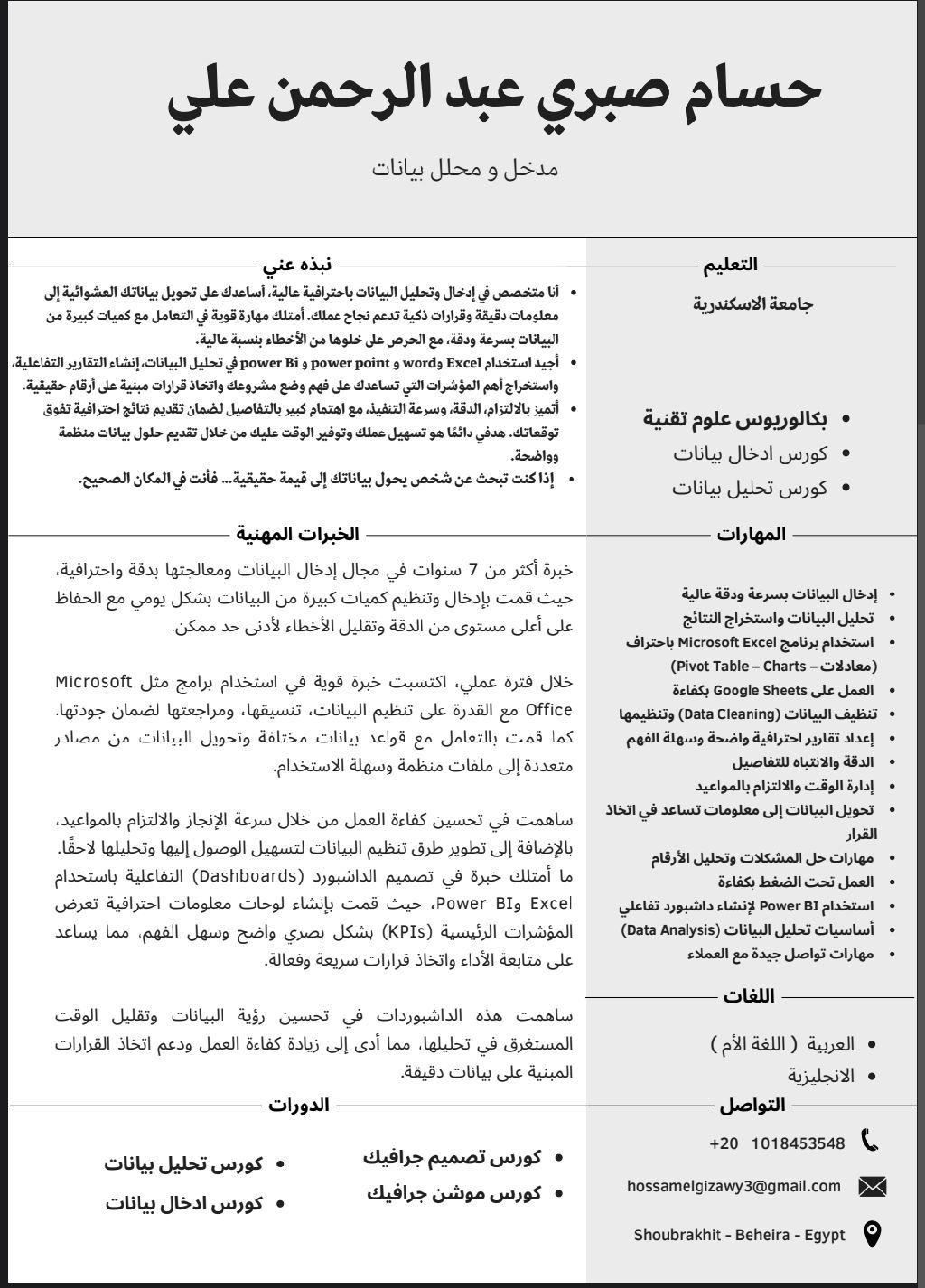 هل تبحث عن دقة وسرعة في ادخال وتحليل البيانات أنا متخصص في تحويل البيانات الى رؤى واضحة تساعدك على اتخاذ قرارات أفضل. خبرة، التزام، ونتائج مضمونة. تواصل الآن وابدأ في تطوير عملك