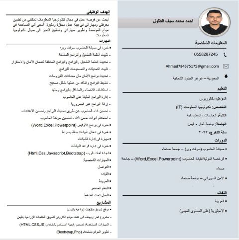 السادة أصحاب العمل، أنا أحمد محمد، حاصل على بكالوريوس تكنولوجيا المعلومات يمني الجنسية، ابحث عن فرصة عمل في مجال الكمبيوتر وتكنولوجيا المعلومات. لدي خبرة في استخدام البرامج الأساسية والتعامل مع الشبكات والأنظمة. أتمتع بمهارات تواصل جيدة وقدرة على العمل في فريق. أنا على استعداد للانضمام الى فريق عملكم وتقديم أفضل ما لدي لنجاح الشركة