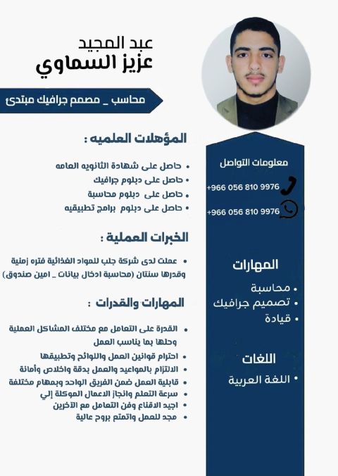 اسمي عبدالرحمن عمري 27 ابحث عن عمل في مجال ادخال البيانات في السعودية أملك دبلوم شبكات ودورة ادخال بيانات أوفيس