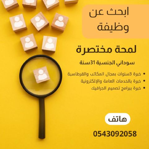 سوداني الجنسية 30 سنة خبرة في الادارة المكتبية خبرة 3 سنوات في مجال مكاتب خدمات الطالب متمكن في مجال القرطاسية والخدمات العامة وبرامج التصاميم ملم بكل خدمات الطالب تسليك ملازم تغليف خدمات عامة والكترونية، عمل مشاريع الطلاب بالفلين والأعمال الفنيه أحتاج بيئة عمل طيبة للانجاز