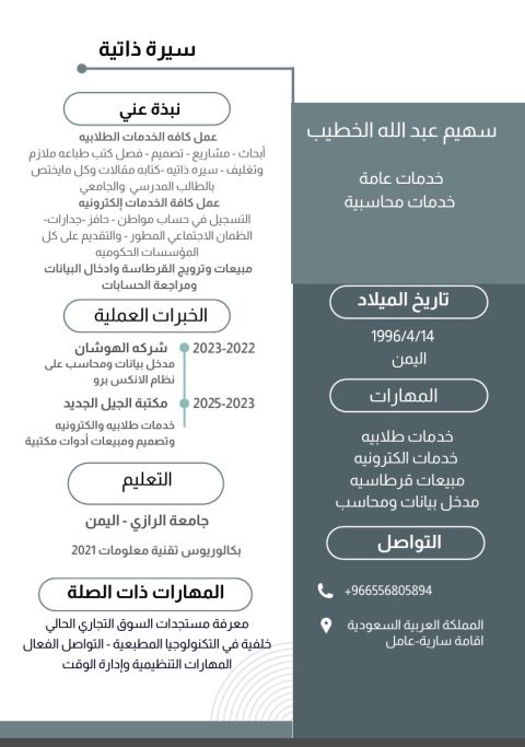 السيرة الذاتية الاسم الكامل شوقي محمد علي صغير قفل الجنسية يمني رقم الجوال 0505709820 رقم الجوال واتساب 0575083932 الإقامة سارية الموقع المملكة العربية السعودية. الهدف المهني باحث عن فرصة عمل في مجال التدريس خدمة العملاء، الاستقبال، الكاشير أو ادخال البيانات، أسعى لتوظيف مهاراتي في التواصل، سرعة التعلم، وتنظيم الوقت لتقديم قيمة مضافة للشركة وتحقيق رضا العملاء. المؤهلات العلمية بك لغة انجليزي