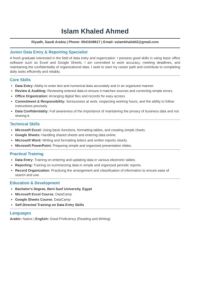 Junior Data Entry & Reporting Specialist ابحث على فرصة شغل أقدر أضيف فيها قيمة من خلال الدقة والتنظيم وجودة البيانات. ملم بأعمال Excel وGoogle Sheets وPower BI word في ادخال البيانات، ترتيبها، ومراجعتها، وكمان اعداد تقارير بسيطة وواضحة. مستوى اللغة الانجليزية مستوى متقدم تحدثا وكتابة ومتواجد في والرياض بإقامة عمل نظامية ومستعد للعمل ونقل الكفالة وعلي داريه بالحسابات والعمل علي برنامج ODOO