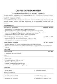 Data Entry Specialist with over 5 years of experience. Highly skilled and a fast learner, always eager to develop and improve. Based in Riyadh and available to start immediately. I hold a valid private driving license and a valid residency. The rest of the details are provided in the CV