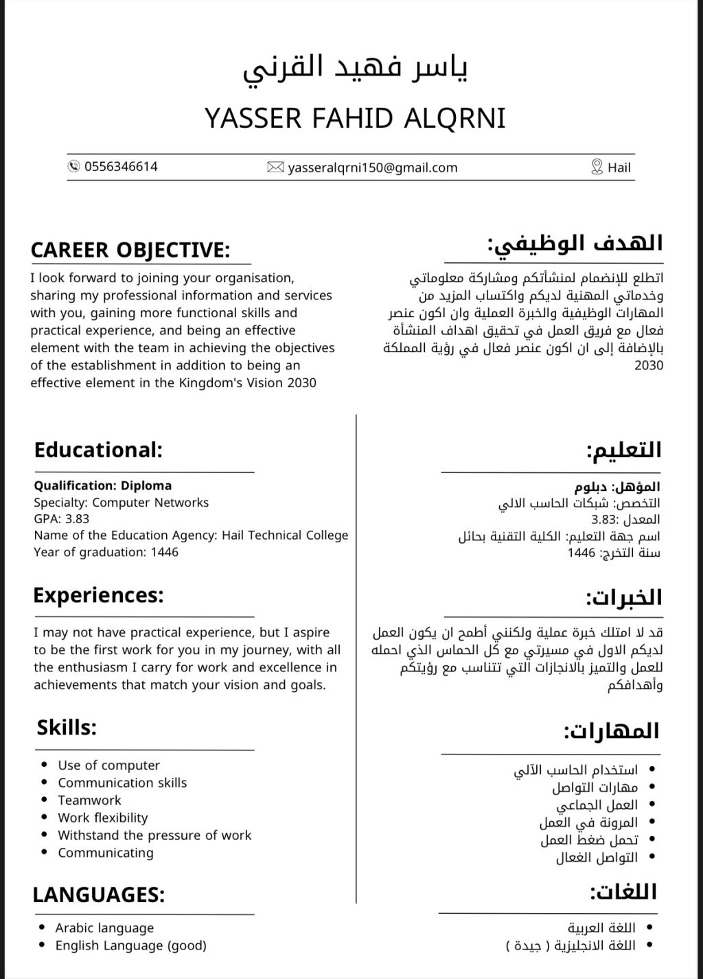 خريج كلية التقنية في حائل حاصل على دبلوم حاسب الى / فني شبكات حاسب الآلي