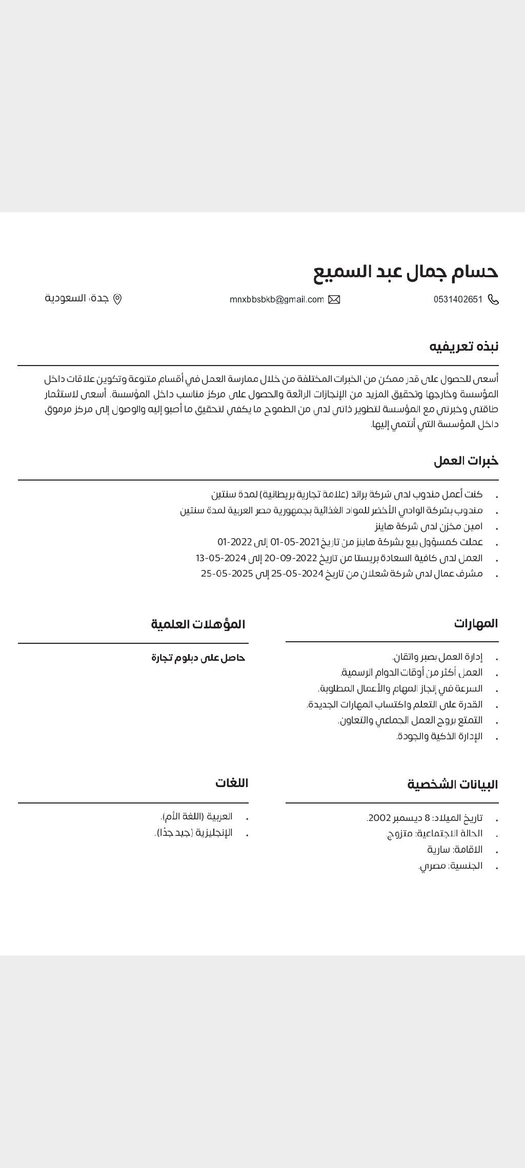 الاسم حسام جمال عبد السميع الإقامة سارية 15 شهر معيا خبرة في تدخيل البيانات سنتين خبرة في مسك مستودعات أو مستودع واحد سنة ونصف خبرة في شغل مكاتب أين كان أي الشغل عندي خبرة سنتين واشتغل مشرف عمال سنة