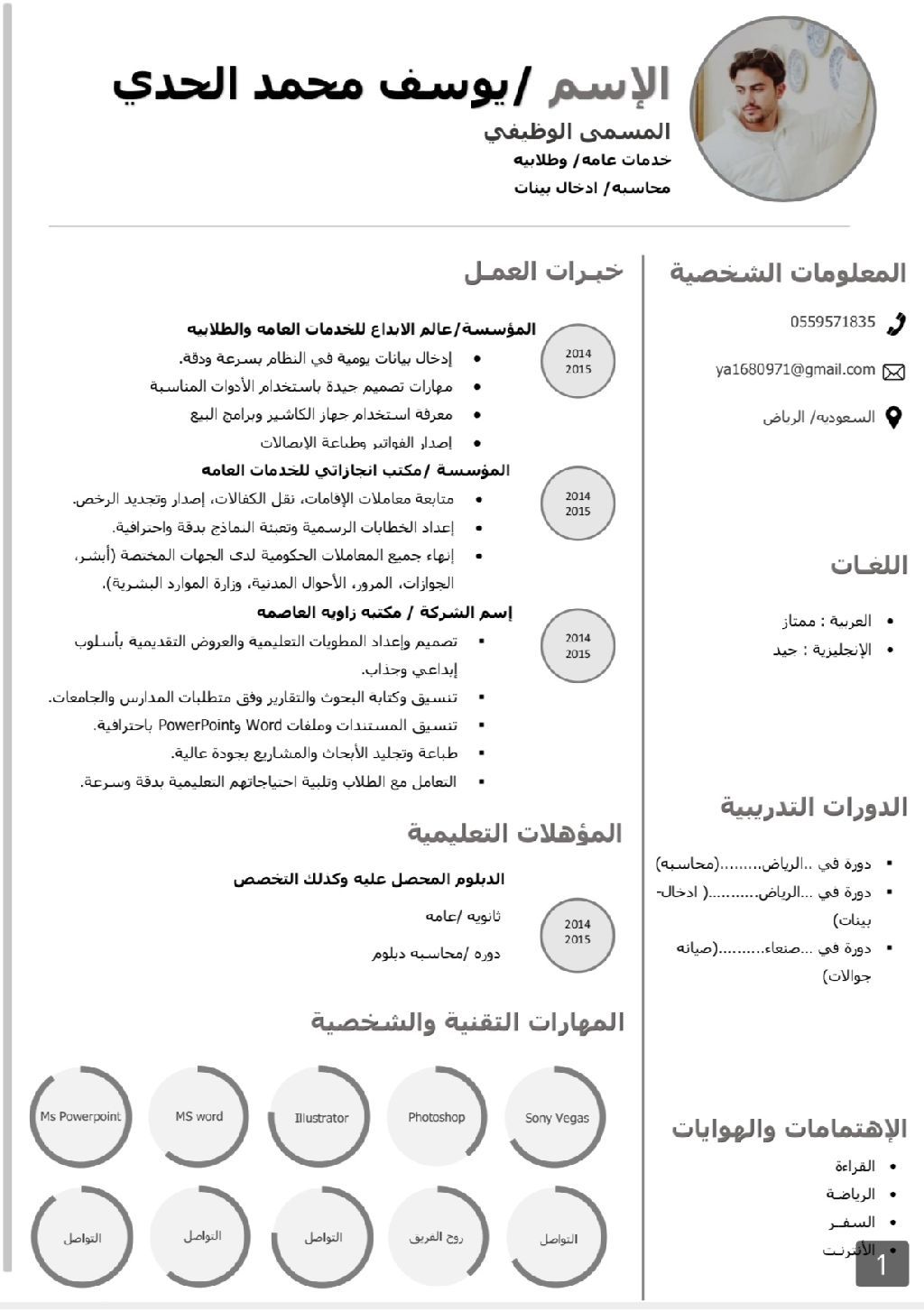 الاسم يوسف العمر 25 الجنسية يمني عملت في مجال التعقيب وتخليص المعاملات الالكترونية مثل ابشر مقيم الجوازات قوئ التأمينات الاجتماعية الموارد البشرية والطلابيه مثل بحوث ثيمات مطويات تصاميم خبرة 3 سنوات