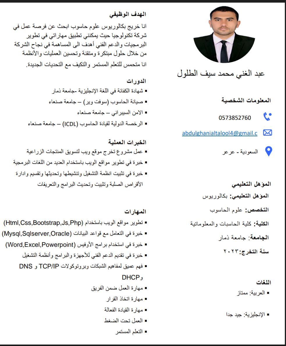 عبد الغني الطلول - يمني الجنسية بكالوريوس علوم حاسوب خبرة في برامج الأوفيس - الطباعة ابحث عن وظيفة في خدمات طلاب - ادخال بيانات - دعم فني - كاشير