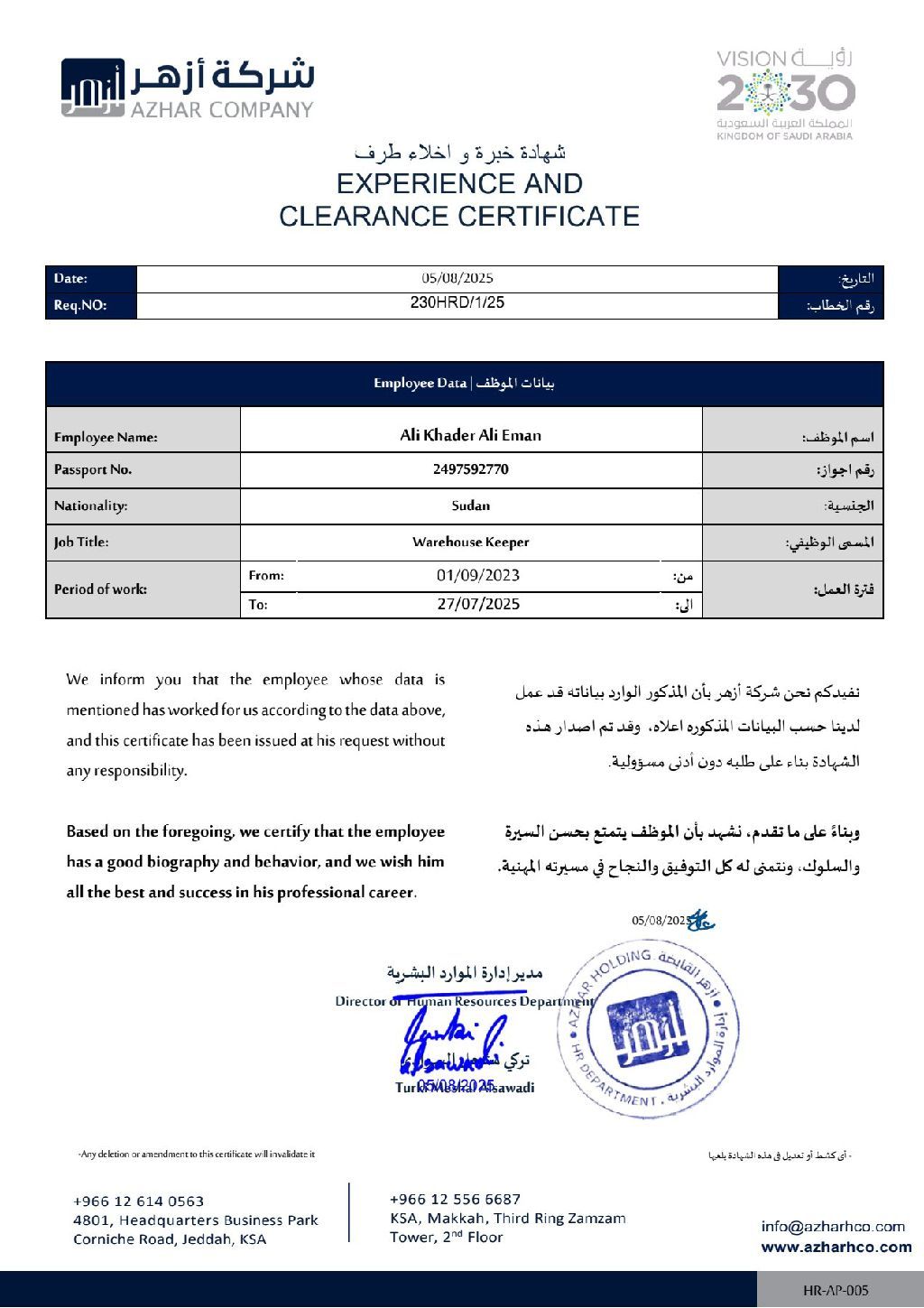 علي خضر سوداني الجنسية، خريج حاسوب، مدخل بيانات وفواتير الكترونية، لدي معرفة بالبرنامج المحاسبية، عملت أمين مستودع شركة مقاولات، وبائع كاشير محلات قطع غيار سيارات وموظف استقبال محل مساج ولدي رخصة قيادة رقم تواصل