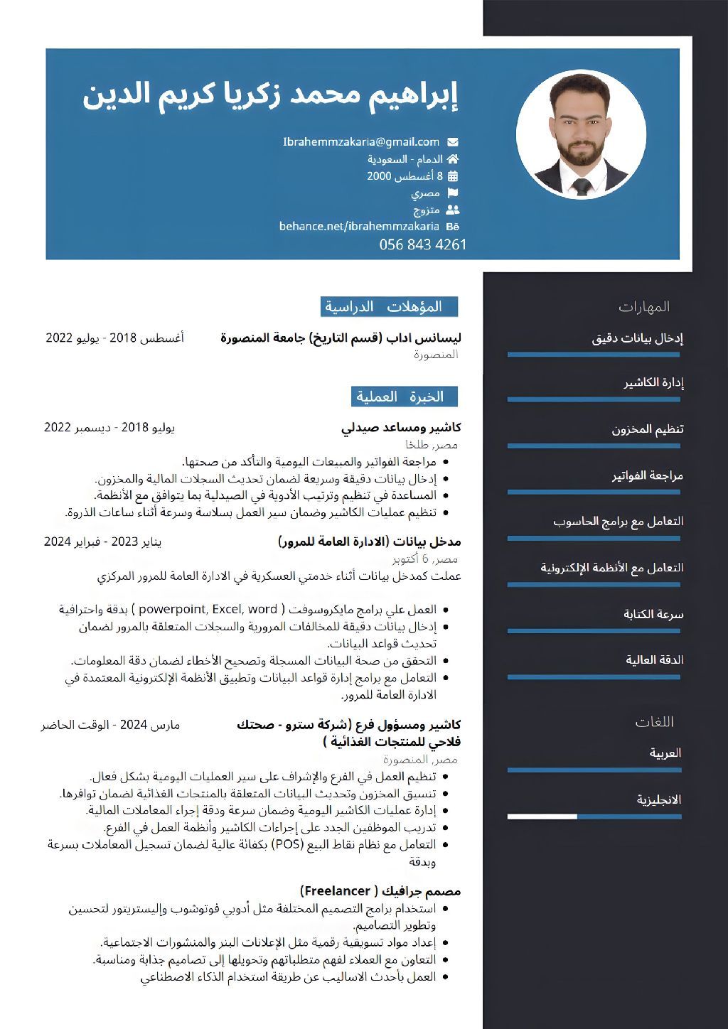 كاشير ومدخل بيانات مصري الجنسية مؤهل عالي 25 سنة مقيم في الدمام ومستعد للانتقال الى أي مكان في المملكة عملت مدخل بيانات خبرة سنة وكاشير 6 سنوات منهم سنتين مسؤول هايبر ووأجيد التعامل مع سيستم odoo أجيد العمل علي برامج مايكروسوفت (word. excel. PowerPoint) وأخذت كورس ICDL ولدي خبرة في برنامج adobe Photoshop