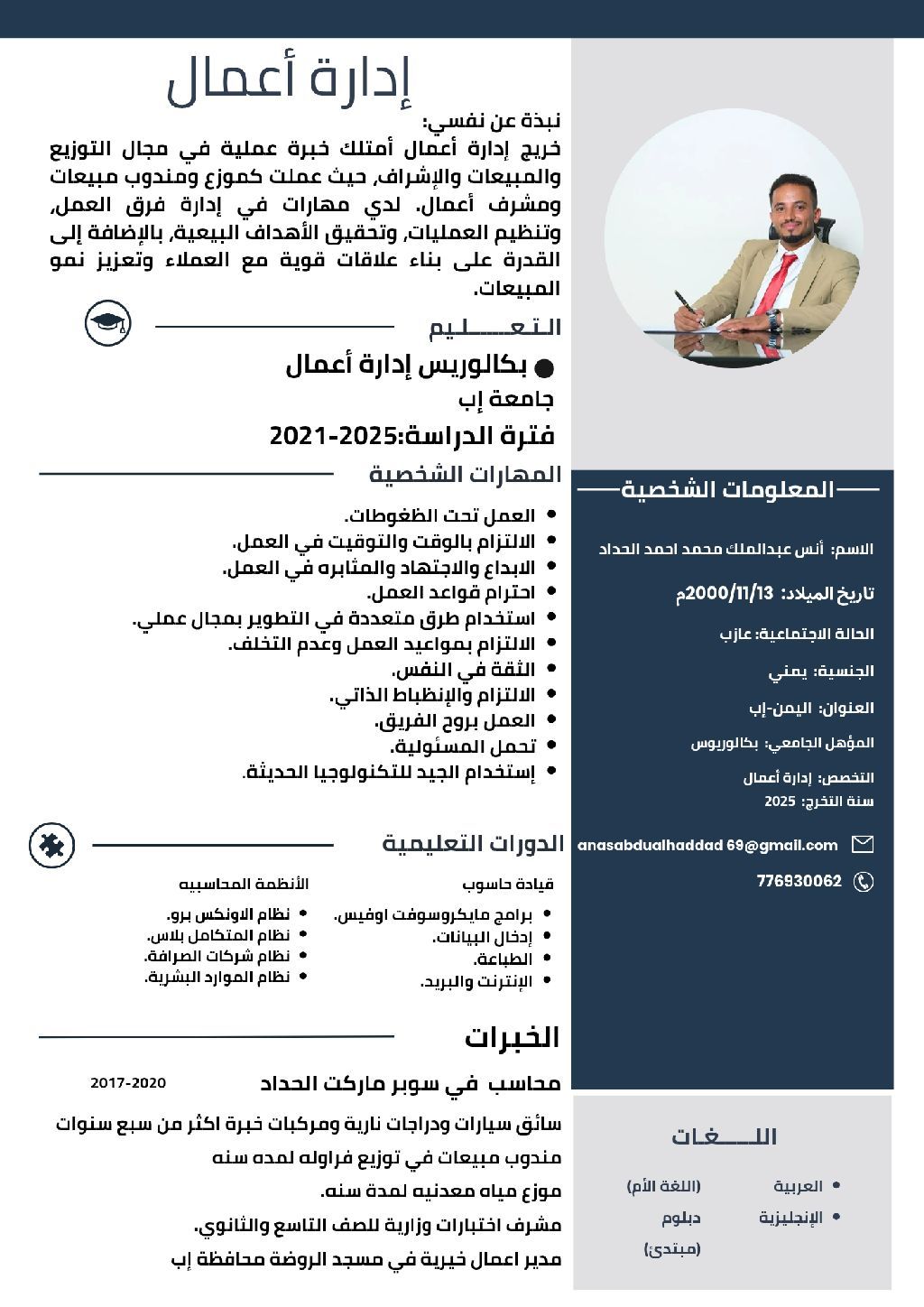 شاب يمني خريج ادارة أعمال متواجد في السعودية عندي خبرة في الطباعة وادارة مكتبات من متابعة مستلزمات ونواقص طلبات العملاء امتلك شهادة تدريب جميع برامج المايكروسوفت أوفيس واطمح في التعلم في أعمال الخدمات الالكترونية وسريع الفهم فقط أريد شخص جاد في تعليمي وابشر بعمل ممتاز