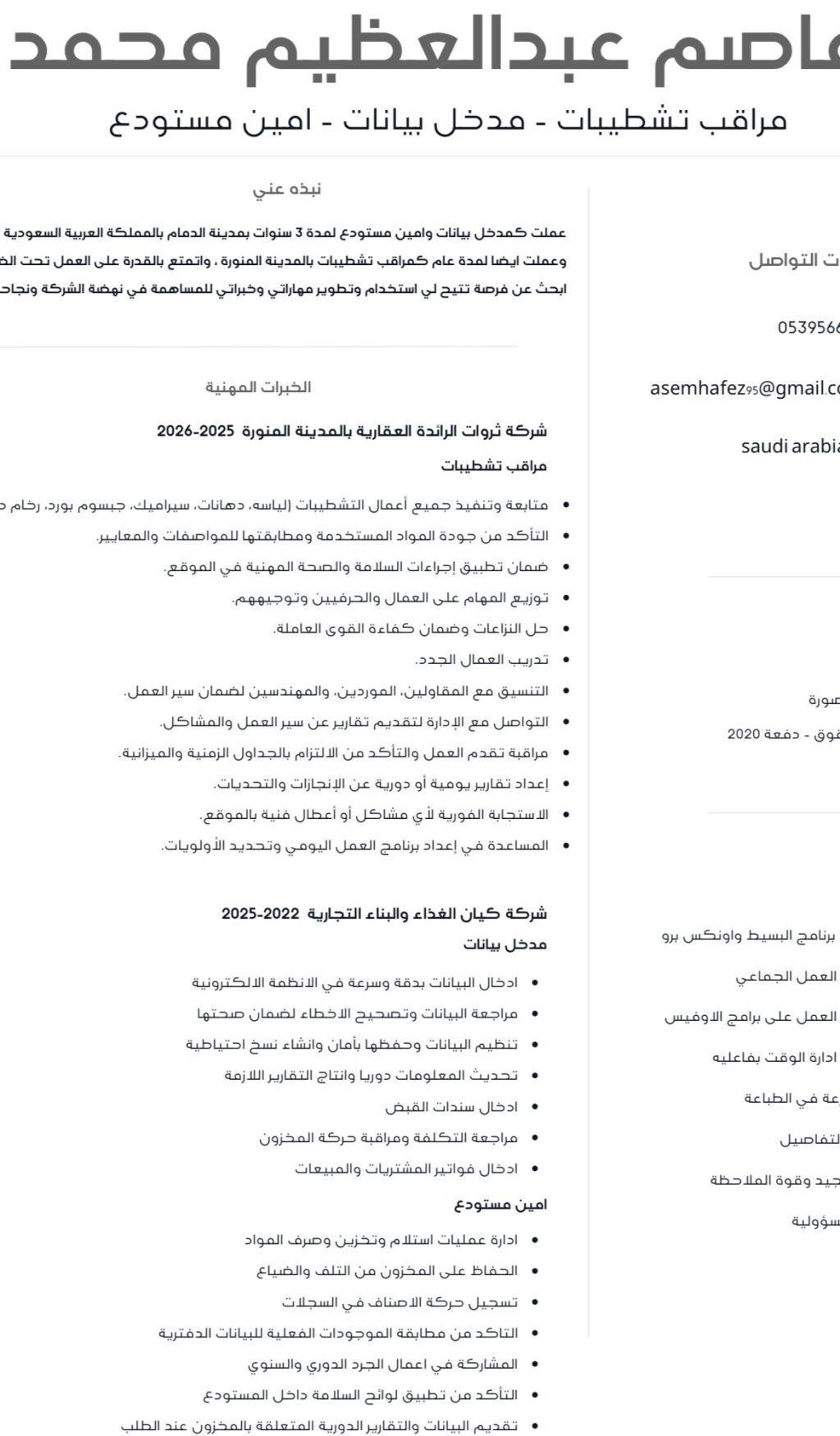 عملت كمدخل بيانات وأمين مستودع لمدة 3 سنوات في مجال المواد الغذائية ومراقب تشطيبات في شركة مقاولات لمدة سنة وأجيد التعامل على برامج الأوفيس