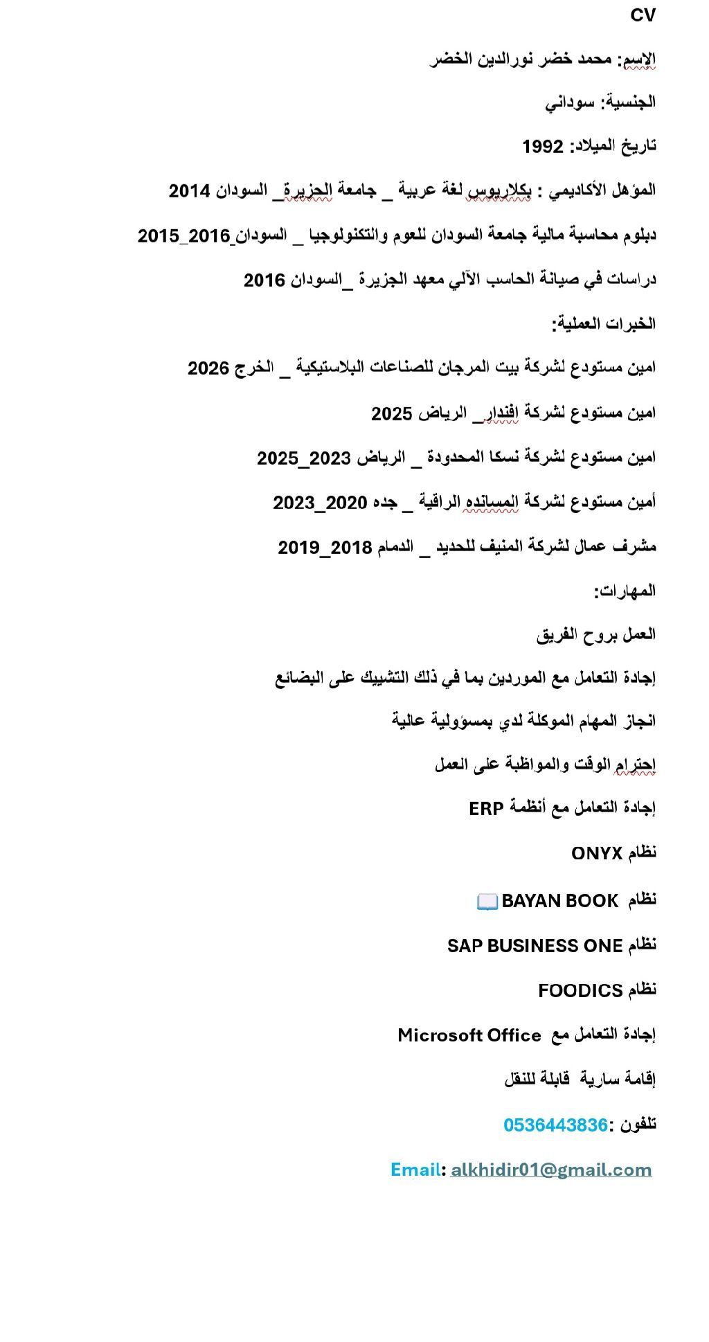 محمد خضر نور الدين سوداني الجنسية ابحث عن عمل أمين مستودع لدي خبرة في المستودعات سبق وعملت فيها شركة نسكا المحدوده للمطاعم - شركة للصناعات البلاستيكية - شركة أفندار للمطاعم أجيد العمل على نظام ساب بزنس ون ونظام فودكس ونظام بيان بوكو نظام أونكس إقامة سارية حتى شهر ديسمبر