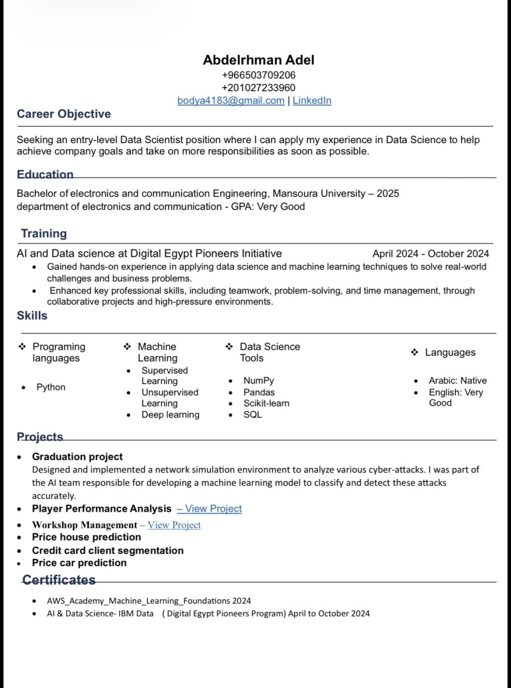 A fresh Data Science graduate looking for a job or internship opportunity in Saudi Arabia. Skilled in Python, Pandas, NumPy, Machine Learning, and Data Analysis with hands - on projects. Available to start immediately