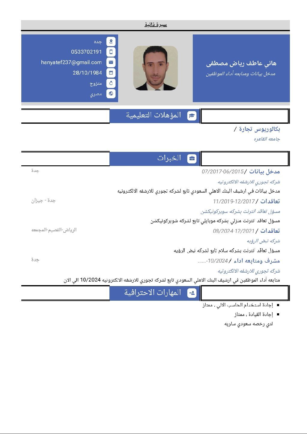 ابحث عن عمل مدخل بيانات عملت لدي البنك الأهلي تابع لشركة تجوري للأرشفة الالكترونية لمدة ثلاث سنوات وكنت مشرف ومتابع أداء موظفين في آخر سنة عمل
