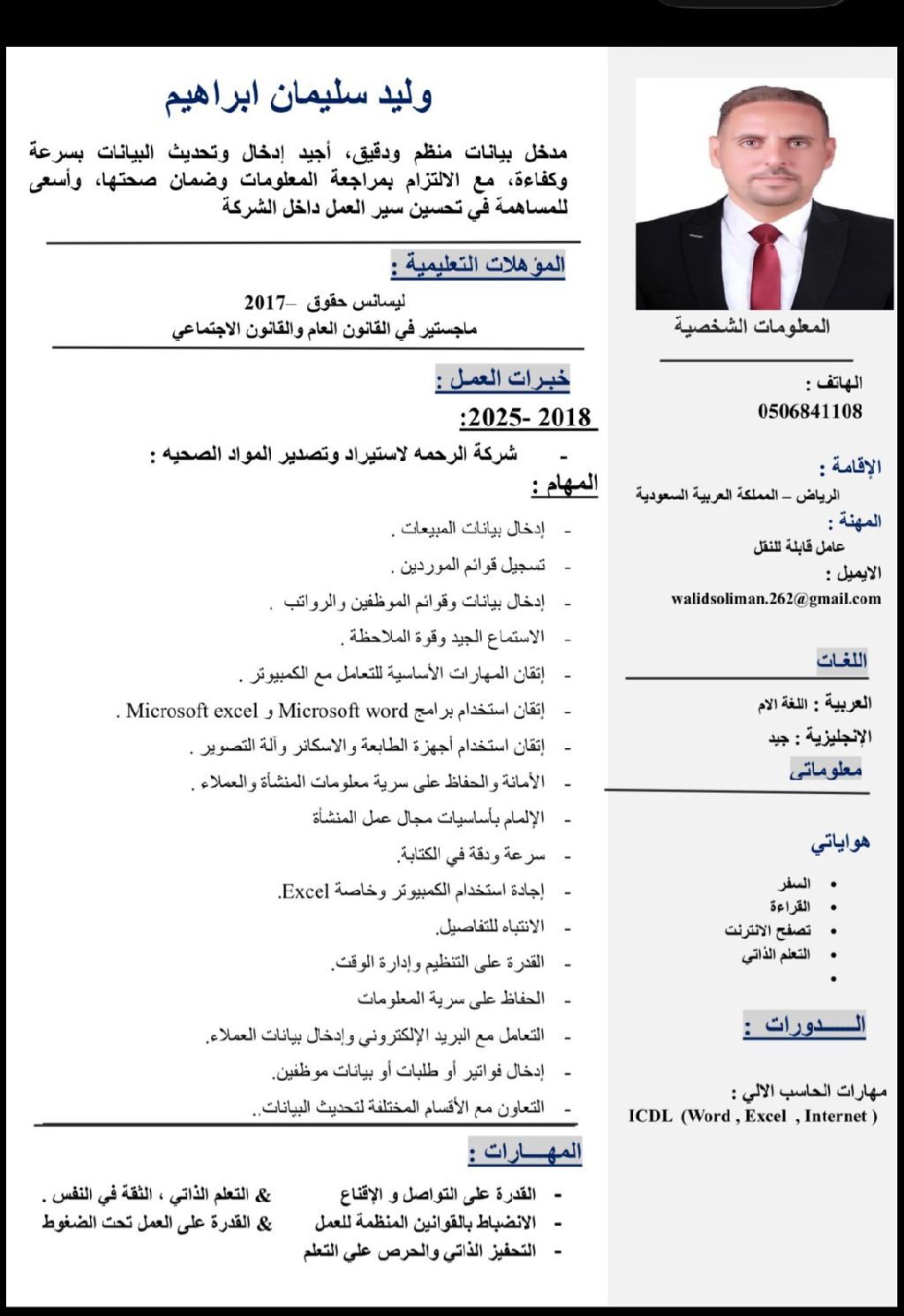 مدخل بيانات منظم ودقيق، أجيد ادخال وتحديث البيانات بسرعة وكفاءة، مع الالتزام بمراجعة المعلومات وضمان صحتها، وأسعى للمساهمة في تحسين سير العمل داخل الشركة سرعة ودقة في الكتابة. اجادة استخدام الكمبيوتر وخاصة Excel. الانتباه للتفاصيل. القدرة على التنظيم وإدارة الوقت. الحفاظ على سرية المعلومات