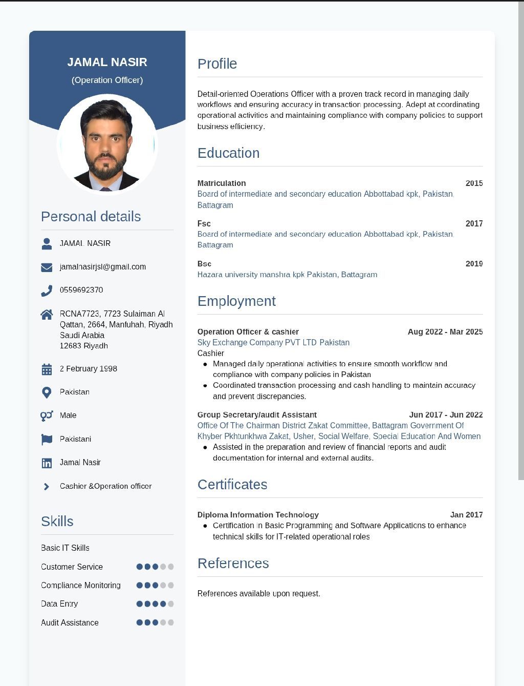 I am writing to apply for a suitable position in your organization, preferably in Cashier, Accounts, or Operations roles. Experience in Exchange Company I have 3 years of experience at Sky Exchange Company (PVT) LTD, Pakistan, where I worked as a Cashier and later as an Operation Officer. During this time, I gained strong expertise in Cash