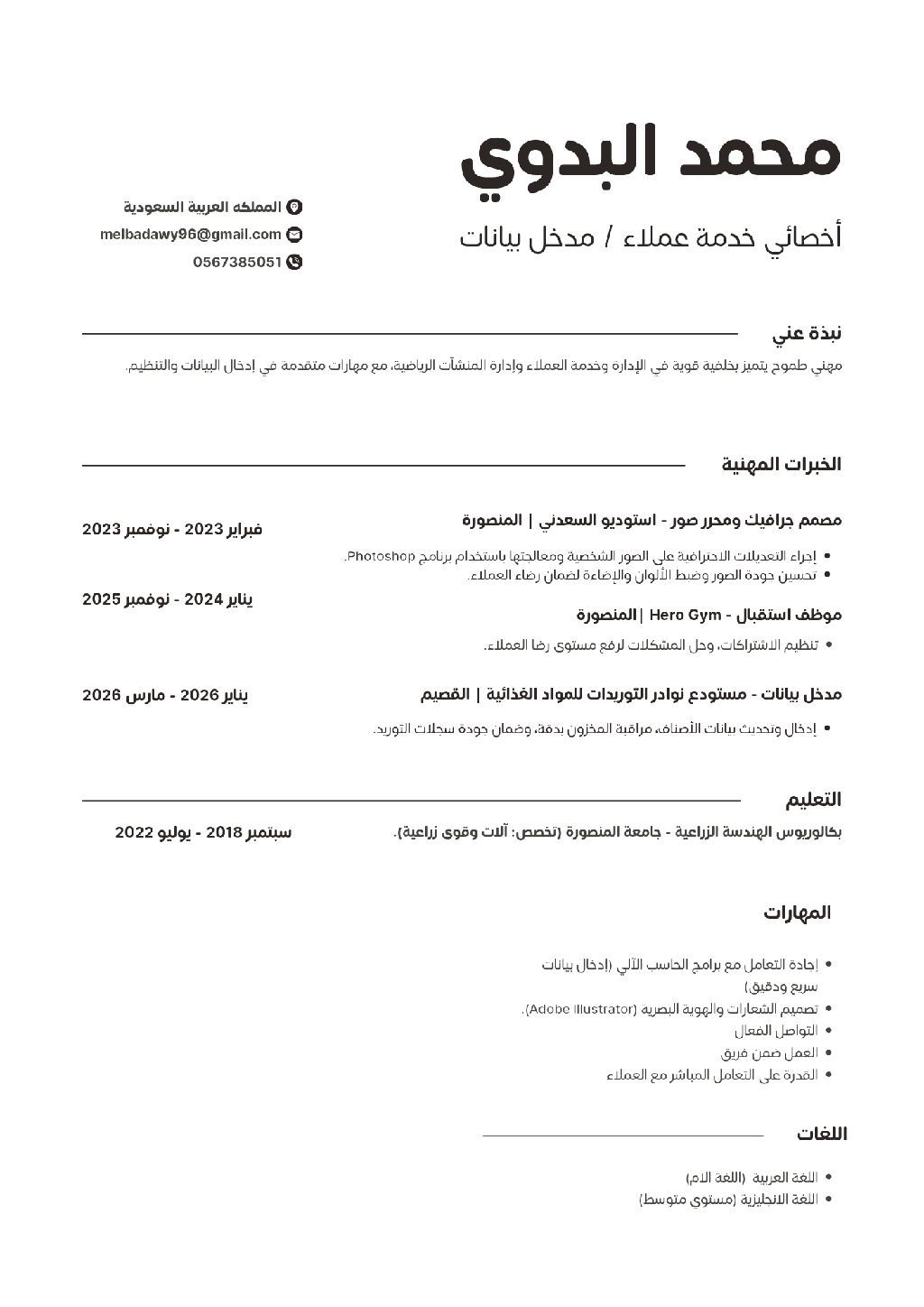 أخصائي اداري ومدخل بيانات بخلفية هندسية، امتلك خبرة واسعة في التعامل مع العملاء وتنظيم الاشتراكات وإدارة حركة المخزون الغذائي. متميز في استخدام برامج الحاسب الآلي ومعالجة الصور باحترافية عبر Photoshop. أسعى لتوظيف مهاراتي في التنظيم وسرعة التعلم لتحقيق أعلى مستويات رضا العملاء وكفاءة العمل