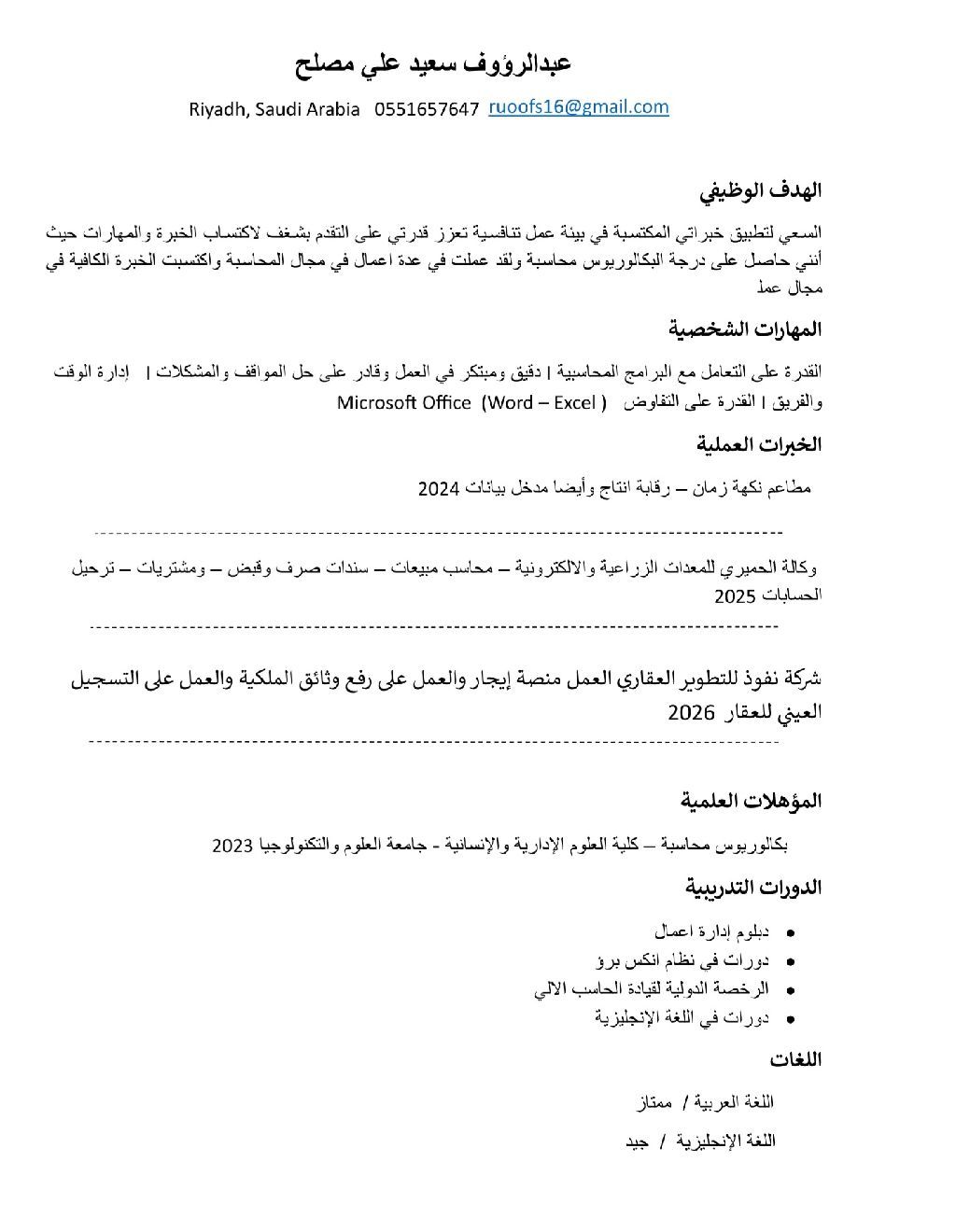 أنا رؤوف أحتاج عمل محاسب أو مدخل بيانات لدي القدرة على الاستيعاب والتعلم والانضباط والعمل بكفائه وفعالية والله الموفق