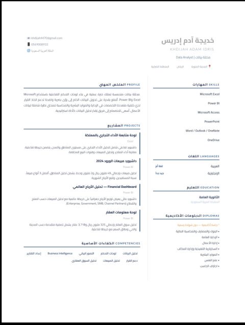 محللة بيانات ابحث عن فرصة عمل في مجال تحليل البيانات وكتابة التقارير وذكاء الأعمال، امتلك مهارات عملية في بناء لوحات التحكم التفاعلية باستخدام Power bi & Microsoft Excel وقد نفذت مشاريع فعلية تشمل تحليل الأداء التجاري على مستوى المملكة وتحليل السوق العقاري والتقارير المالية، خلفيتي الأكاديمية متعددة التخصصات تشمل إدارة الأعمال، الموارد البشرية، والمحاسبة، والسكرتارية، وعلم النفس، ارحب بأي فرصة عمل