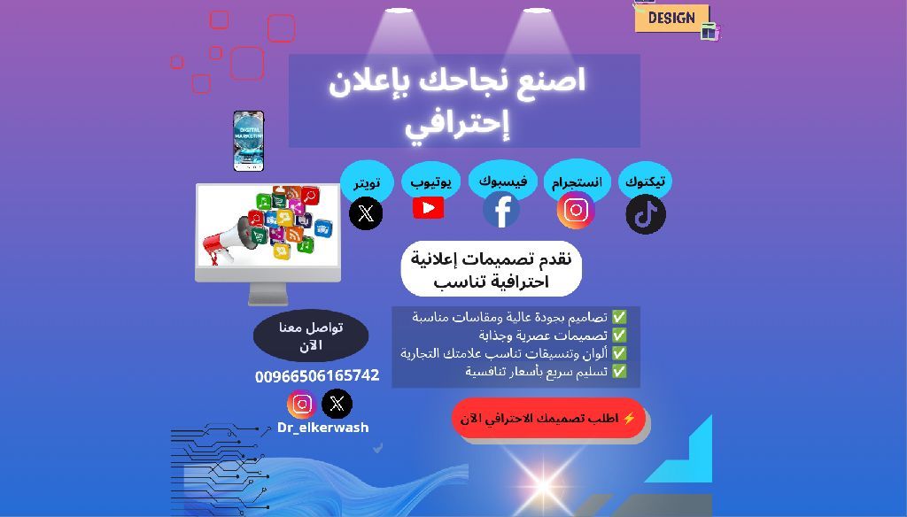 Need a professional ad design to attract customers and boost your success We offer high - quality ad designs with perfect dimensions, eye - catching colors, and fast delivery at competitive prices Suitable for all social media platforms Modern and engaging designs Order your design now Contact us