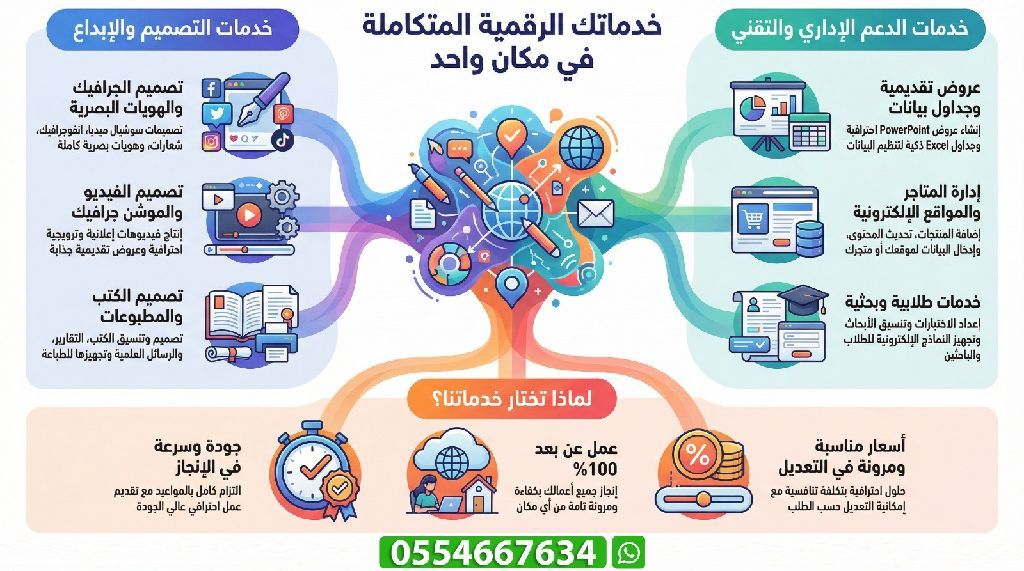 خدمات رقمية عن بعد - تصميم فيديو بوربوينت اكسل متاجر أقدم خدمات احترافية عن بعد تشمل تصميم جرافيك واعلانات فيديوهات ترويجية عروض PowerPoint شغل Excel تصميم كتب وتجهيزها للطباعة لوغو وهوية تجارية انفوجرافيك وخرائط ذهنية إدارة مواقع ومتاجر الكترونية خدمات الكترونية للطلاب والباحثين سرعة جودة سعر مناسب راسلني مباشرة للتفاصيل