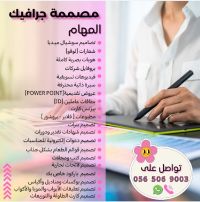 أنا مصممة جرافيك يسعدني أن أقدم لكم خدماتي في مجال التصميم الجرافيكي شعارات بوسترات هويات بصرية بزنس كارد بطاقات موظفين بروفايل تجاري باركود خاص بك لائحات تجارية منيوهات مطاعم ولوغو الشركة أو بوتيك بوكسات بجميع الأنواع والاشكال بطاقات شخصية بطاقات تهنئة بطاقات دعوة بشارة مولود غلاف الاكواب - غلاف المناديل - تعليقات الأبواب - تعليقات المياه - تصاميم التوزيعات - كروت الطاولة والضيافة. عروض تقديمية