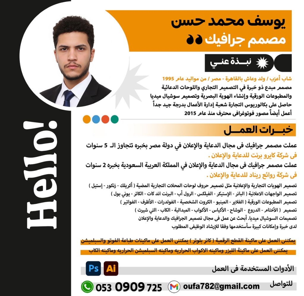 ابحث عن عمل مصمم جرافيك لدى شركات الدعاية والاعلان والطباعة خبرة 7 سنوات، أجيد العمل على برامج التصميم (الفوتوشوب والاليستريتور) متخصص في تصميم الواجهات التجارية الاعلانية وتصميم الحروف المضيئة وتصميم المطبوعات الورقيه والهدايا لدى خبرة كافية بالسوق والأسعار وكل موسم في السنة