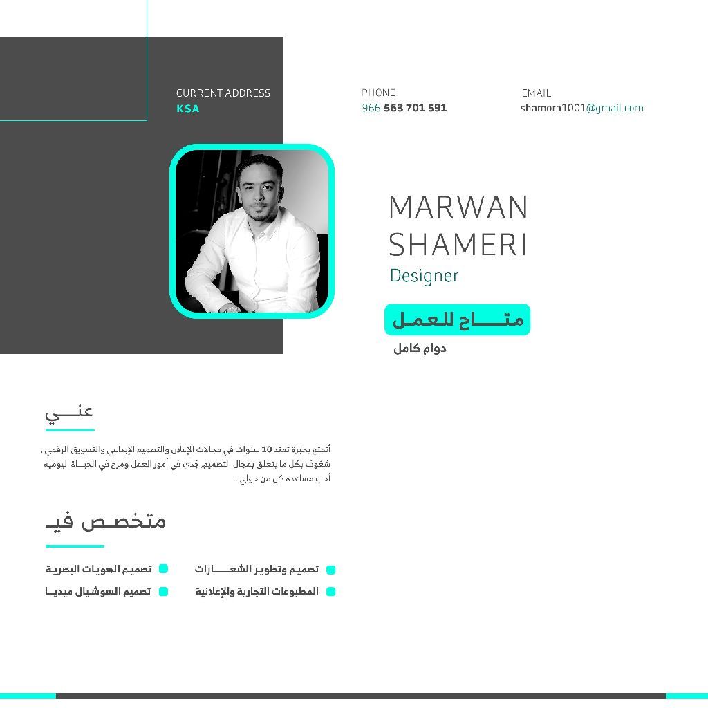 مصمم جرافيك، متاح للعمل بدوام كامل خبرة في مجال الدعاية والاعلان وتنفيذ التصاميم والأعمال الاعلانية والتسويقية