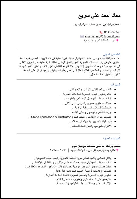 مصمم جرافيك بخبرة 4 سنوات في مجال الدعاية والاعلان، خبرة عملية في تصميم المواد الاعلانية التعامل مع طابعات البنرات والأستكرات تشغيل والتعامل مع ماكينات قص الليزر التواصل مع العملاء وفهم متطلباتهم وتنفيذها بدقة جاهز للعمل بروح الفريق وتحمل ضغط العمل