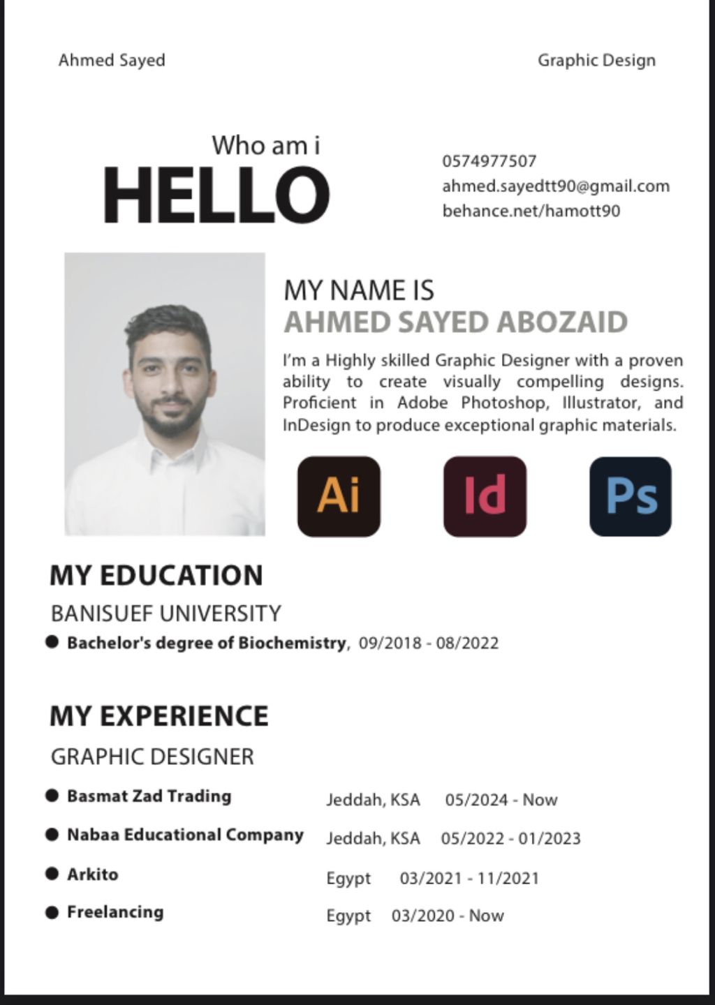 مصمم جرافيك مبدع ومتمكن ابحث عن فرصة عمل لدي خبرة في تصميم الشعارات الاعلانات البروشورات، والسوشيال ميديا بتصاميم عصرية ومبتكرة تعكس هوية العلامة التجارية بأفضل شكل اتقان برامج Adobe Photoshop وIllustrator - القدرة على تحويل الأفكار الى تصاميم واقعية جذابة - السرعة في الانجاز والدقة في التفاصيل