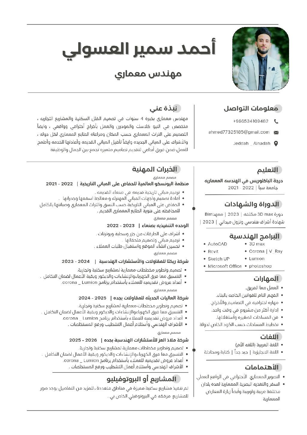 المهندس أحمد سمير العسولي مهندس معماري مقيم في جدة امتلك خبرة محلية وبالمملكة السعودية لمدة قرابة 4 سنوات، ابحث عن عمل يناسب مهاراتي، أعمالي وخبراتي كثيرة تصاميم ابداعية واخراج ثري دي محترف وانجاز سريع بالوقت، لمزيد من التفاصيل التواصل على الواتساب وسيتم ارسال الأعمال المرفقه في البروتوفيليو الخاص بي