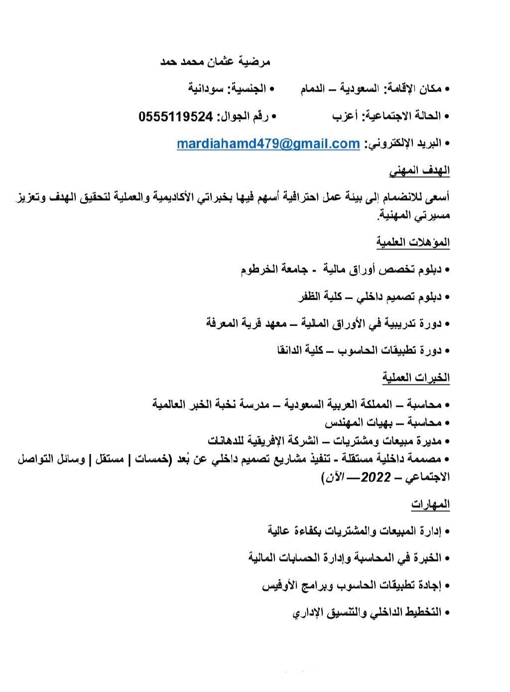 مصمم داخلي سودانية، لدي خبرة 7 سنوات في مجال الديكورات وتركيب الالوان ومبيعات منتجات الديكور والتصميم الداخلي، اسعي للانضمام الى بيئة عمل احترافية أسهم فيها بخبراتي العلمية والعملية لتحقيق أهداف المنشأة وتعزيز مسيرتي المهنية