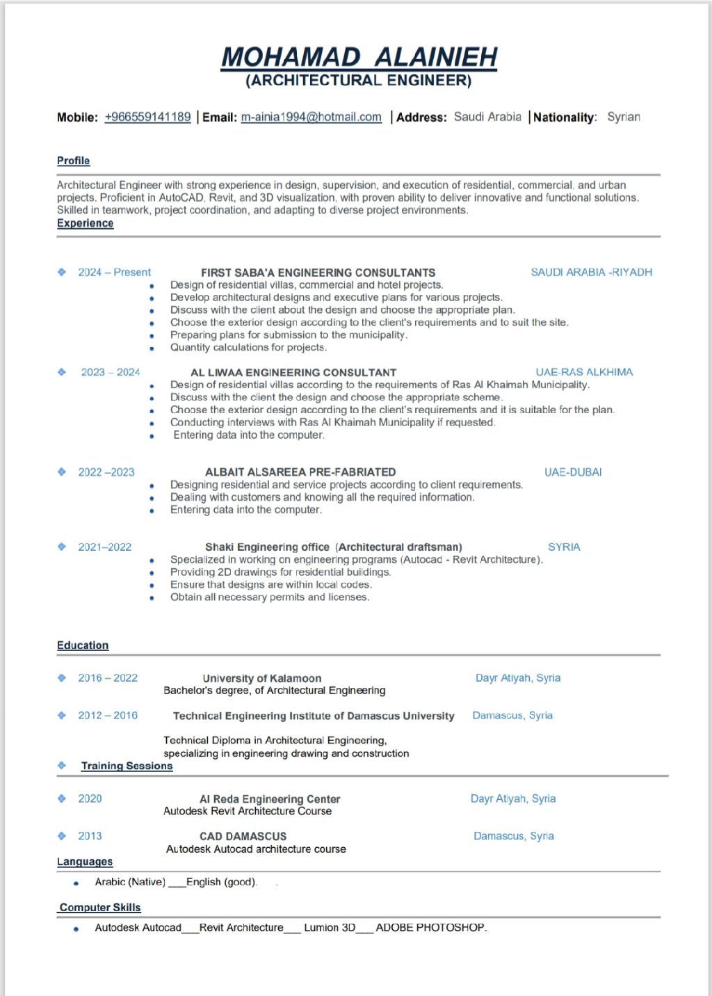 Architectural Engineer holding a Bachelor’s degree in Architecture, with over 3 years of experience working in engineering consultancy offices. Skilled in preparing architectural drawings, coordinating with other disciplines, and ensuring compliance with building codes and approved standards. Participated in residential and commercial projects from the design stage through to detailed construction