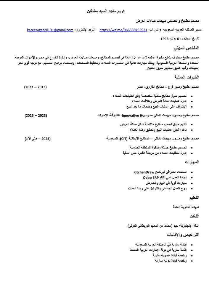 I am Kareem Soltan. 32 years old. I worked as kitchen designer and showroom sales specialist. 12 years of experience in kitchen and dressing room design. I am proficient in using the program kitchen draw and Odoo ERP