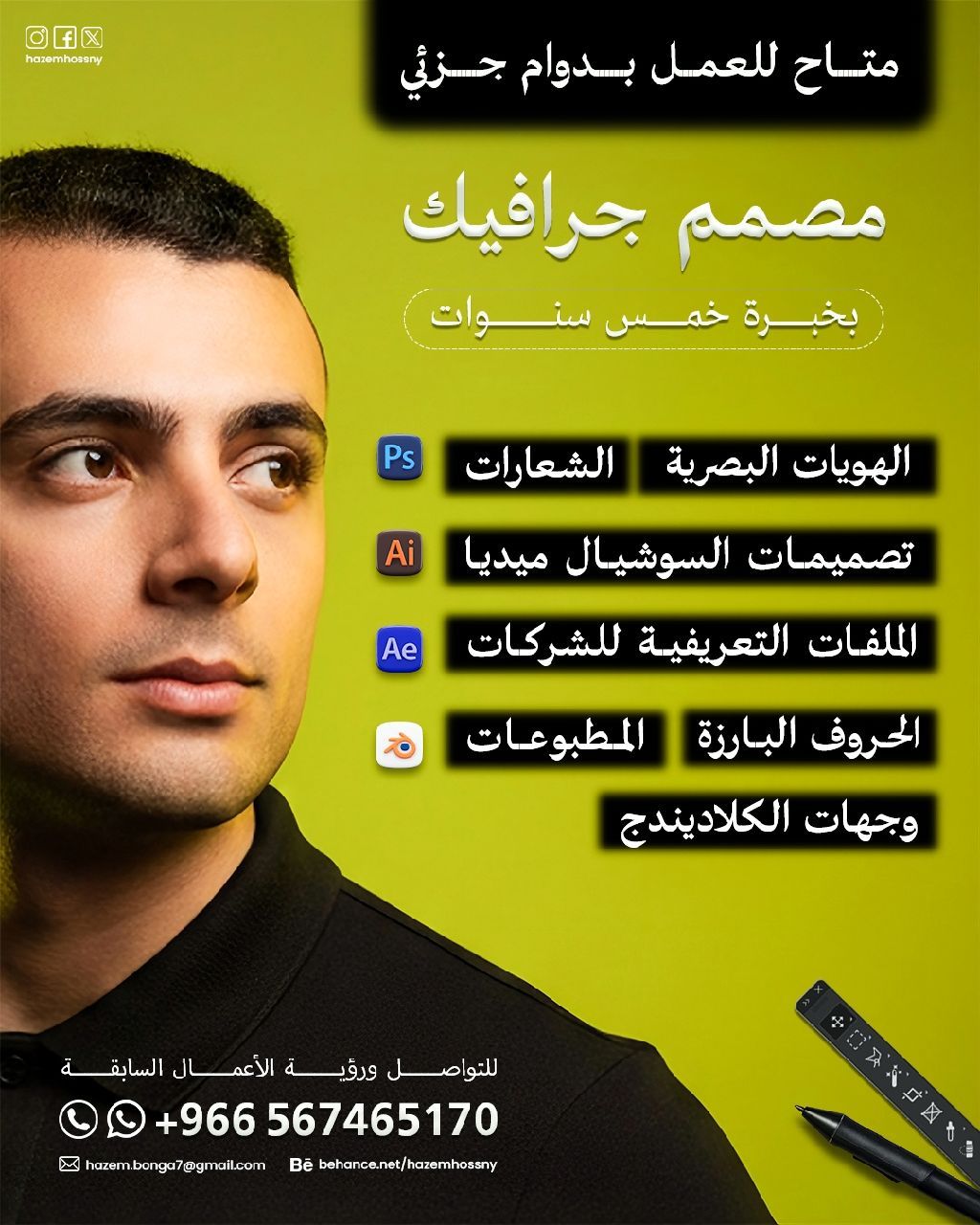 مصمم جرافيك بخبرة خمس سنوات متاح للعمل عن بعد أو عمل جزئي. للتواصل ورؤية الأعمال السابقة يرجى التواصل