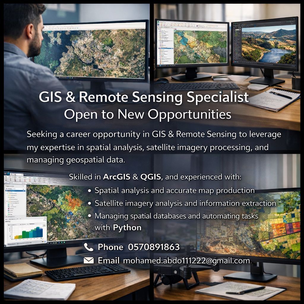 أخصائي نظم معلومات جغرافية والاستشعار عن بعد بخبرة 8 سنوات متاح لفرص جديدة. متخصص في تحليل البيانات المكانية وصور الأقمار الصناعية، وتحويلها الى رؤى واضحة تدعم التخطيط واتخاذ القرار امتلك خبرة عملية في التحليل المكاني إدارة قواعد البيانات الجغرافية، واعداد الخرائط والتقارير الاحترافية باستخدام ArcGIS وQGIS وPython