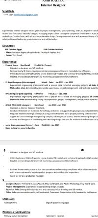 Interior designer with experience in furniture design, execution, and receiving work from carpenters and CNC drilling machines (6 years experience) and production manager. Proficient in Polyboard, Spire, and Cabinet Version software for working with CNC drilling machines. Production engineer also creates catalogs and extracts files for CNC drilling machines