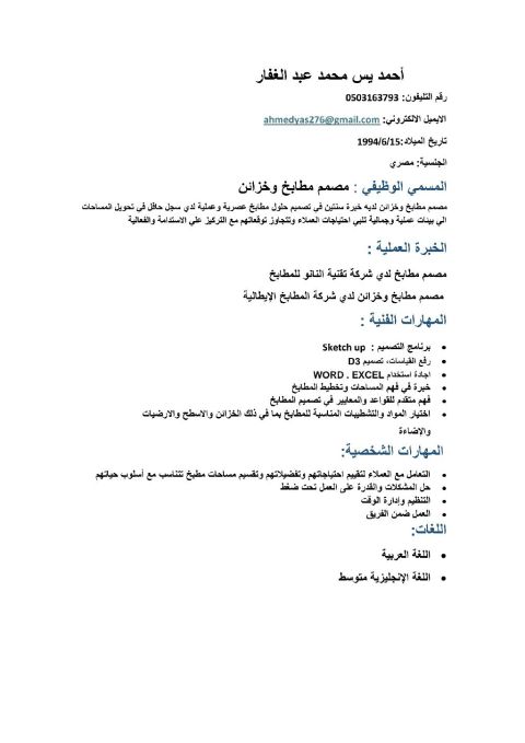 خبرة سنتين في تنفيذ وتصميم المطابخ والخزائن ورفع المقاسات أجيد التعامل على برنامج التصميم SketchUp