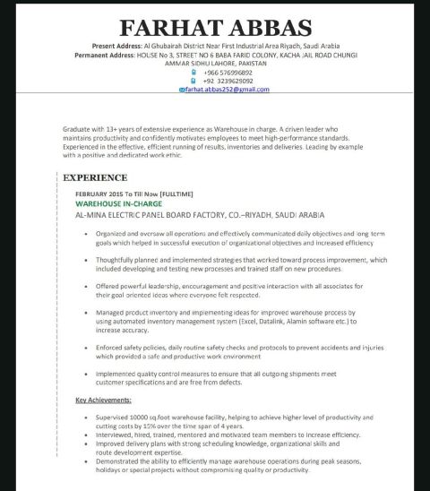I am an experienced Warehouse Supervisor with over 13 years of hands - on experience in warehouse operations, inventory control, logistics coordination, and team leadership. Currently working in Riyadh, Saudi Arabia at an Electrical Panel Board Manufacturing Factory, managing a 10000 SqFt. warehouse, improving efficiency, reducing costs, enforcing safety standards