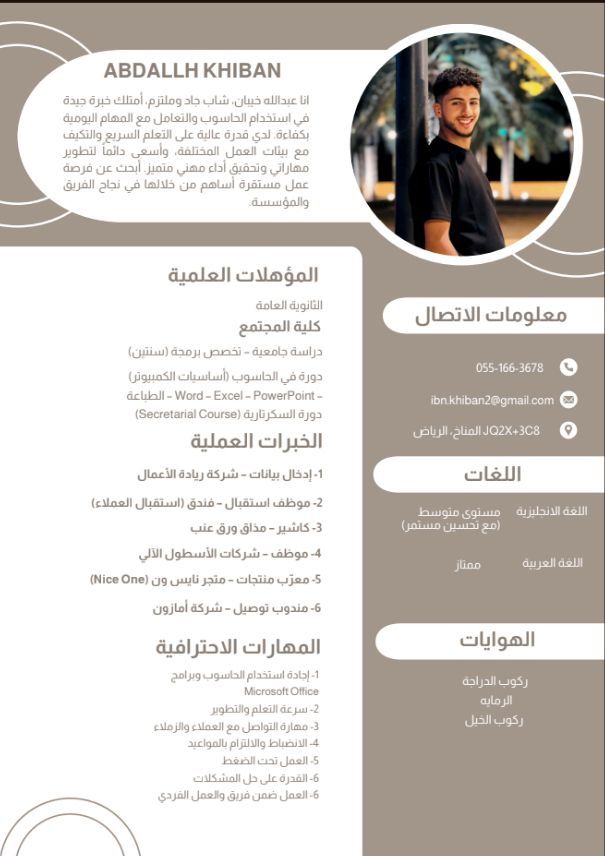 أنا عبدالله شاب طموح وابحث عن فرصة عمل في أي مجال مناسب أجيد استخدام الحاسوب وأتعلم بسرعة ولدي القدرة على العمل تحت الضغط ومع الفريق مستعد للعمل في ايت مجال (أو أي مجال آخر حسب الحاجة)