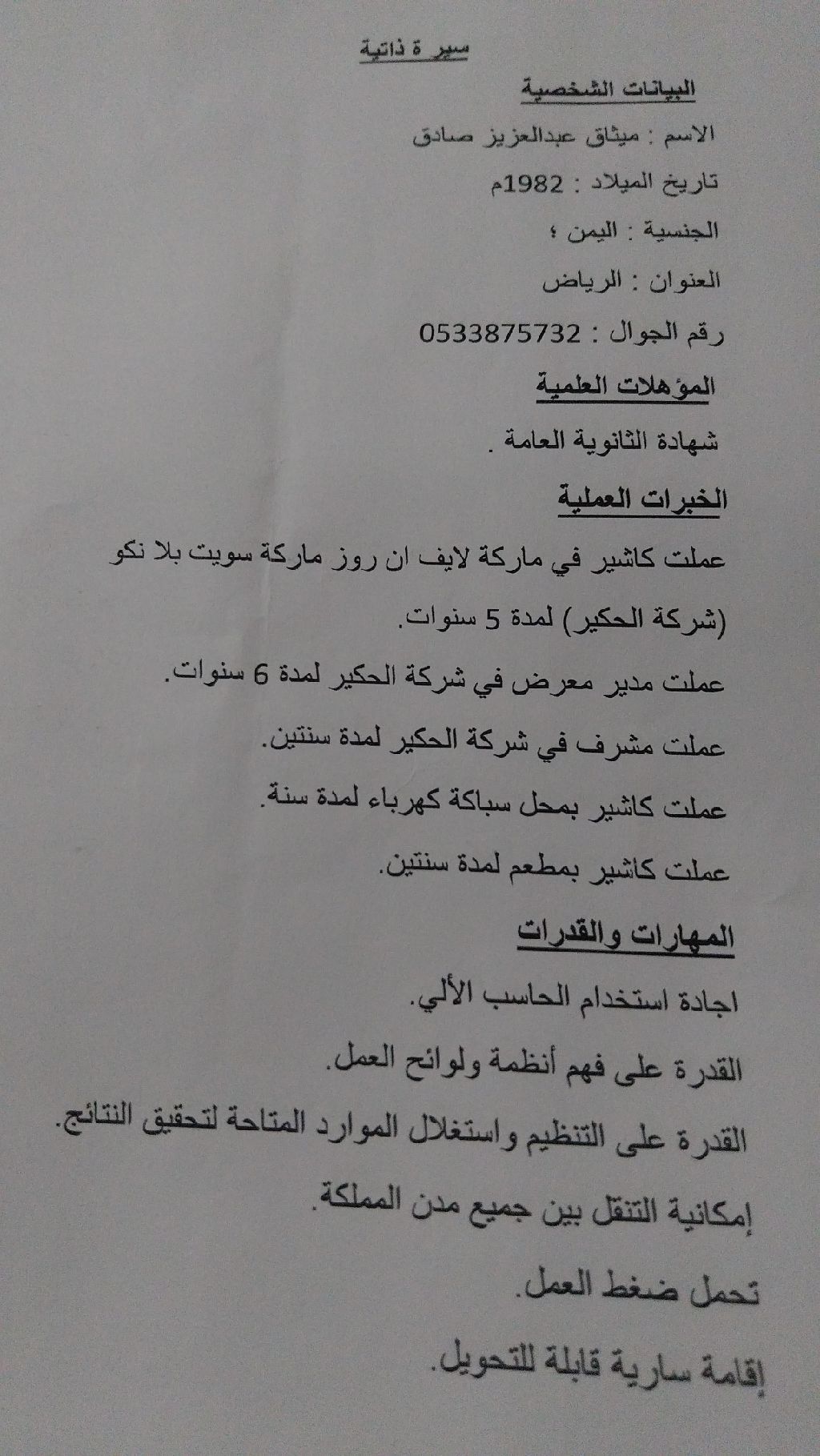 أنا يمني مقيم في السعودية ابحث عن عمل في مجال بيع الملابس الجاهزه أو كاشير أو مدير معرض أو مشرف محلات أو في محل سباكه وكهرباء أو في مغسلة ملابس