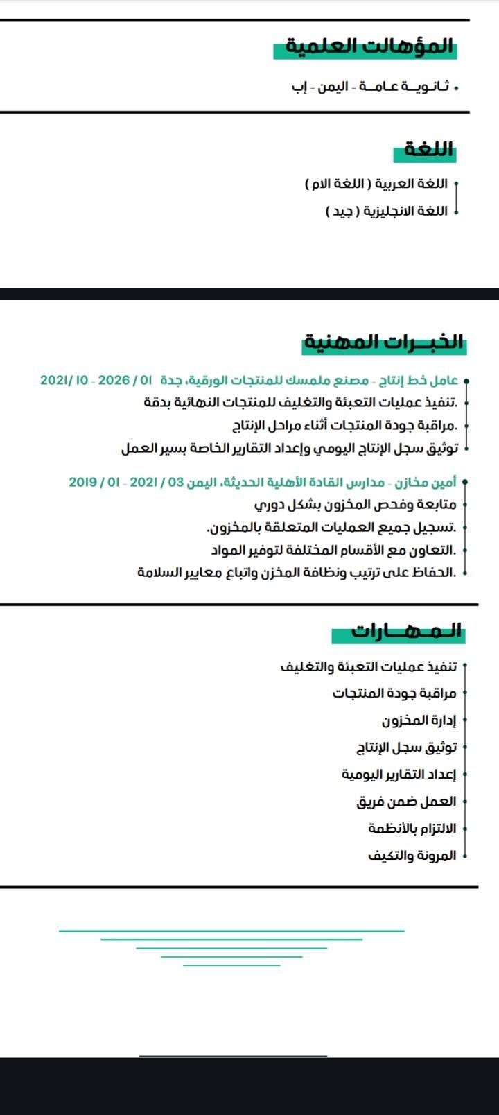 اشتغلت عامل انتاج في مصنع مناديل لمدة أربع سنوات واشتغلت أمين مخزن لمدة سنتين