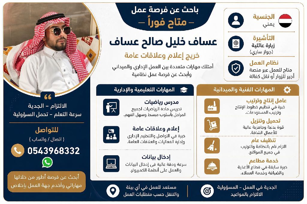 كفاءة يمنية متعددة المهارات (زيارة عائلية) متاح للعمل فورا أنا عساف خليل صالح عساف، خريج اعلام وعلاقات عامة، أجمع بين المهارة التعليمية والخبرة الميدانية، وابحث عن فرصة عمل نظامية. الجانب التعليمي والاداري مدرس رياضيات خصوصي متمكن من تدريس المادة لجميع المراحل بأسلوب مبسط. اعلام وعلاقات عامة خريج متخصص في التواصل والتنظيم الاداري. ادخال بيانات سرعة ودقة عالية