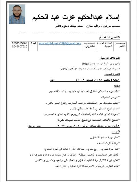 اسلام عبد الحكيم عزت محترف في قطاع التجزئة والمخازن والمحاسبة بخبرة عملية متعددة في الهايبر ماركت والسوبر ماركت والمخازن وإدارة الموردين داخل المملكة العربية السعودية. امتلك خبرة عملية منذ 2018 وحتى 2025 في مجالات البيع المباشر، الكاشير، إدارة المخزون، ادخال البيانات، ومحاسبة الموردين. أبرز الخبرات والمهارات كاشير - التعامل مع أنظمة نقاط البيع POS والدفع الالكتروني واغلاق العهد اليومية بائع - خدمة