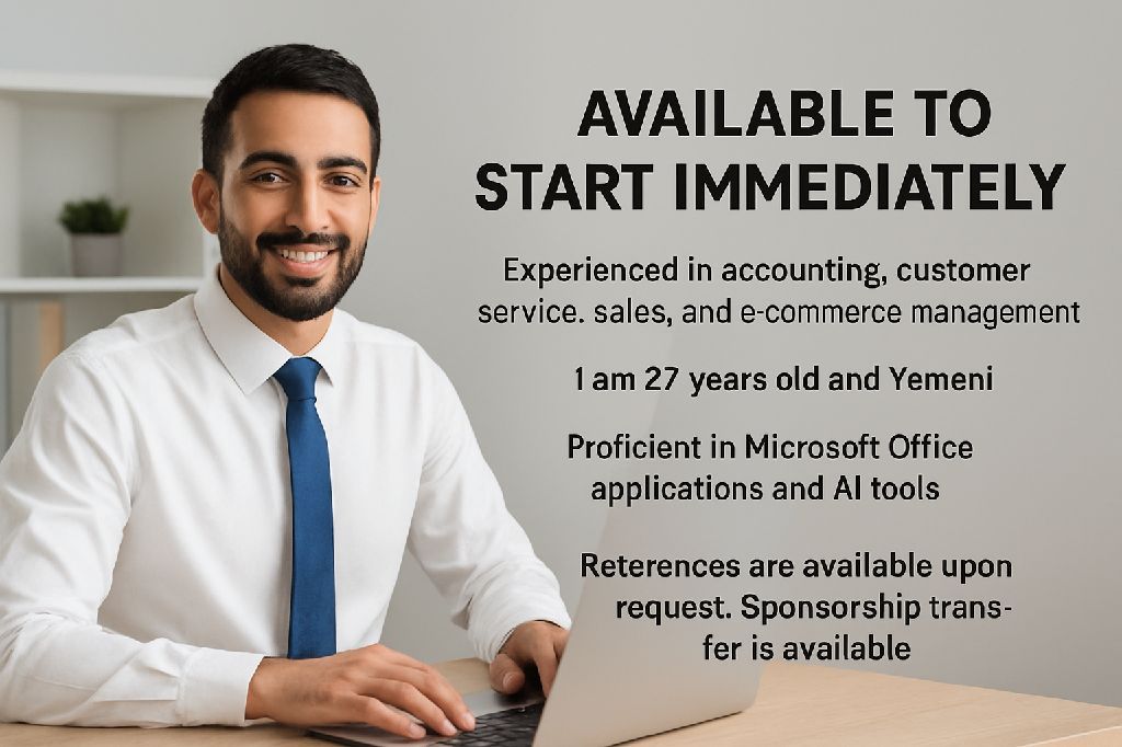 Fully available to start immediately. I have experience in accounting, customer service, sales, and e commerce management. I am 27 years old and Yemeni. Proficient in Microsoft Office applications and AI tools. References are available upon request. Sponsorship transfer is available