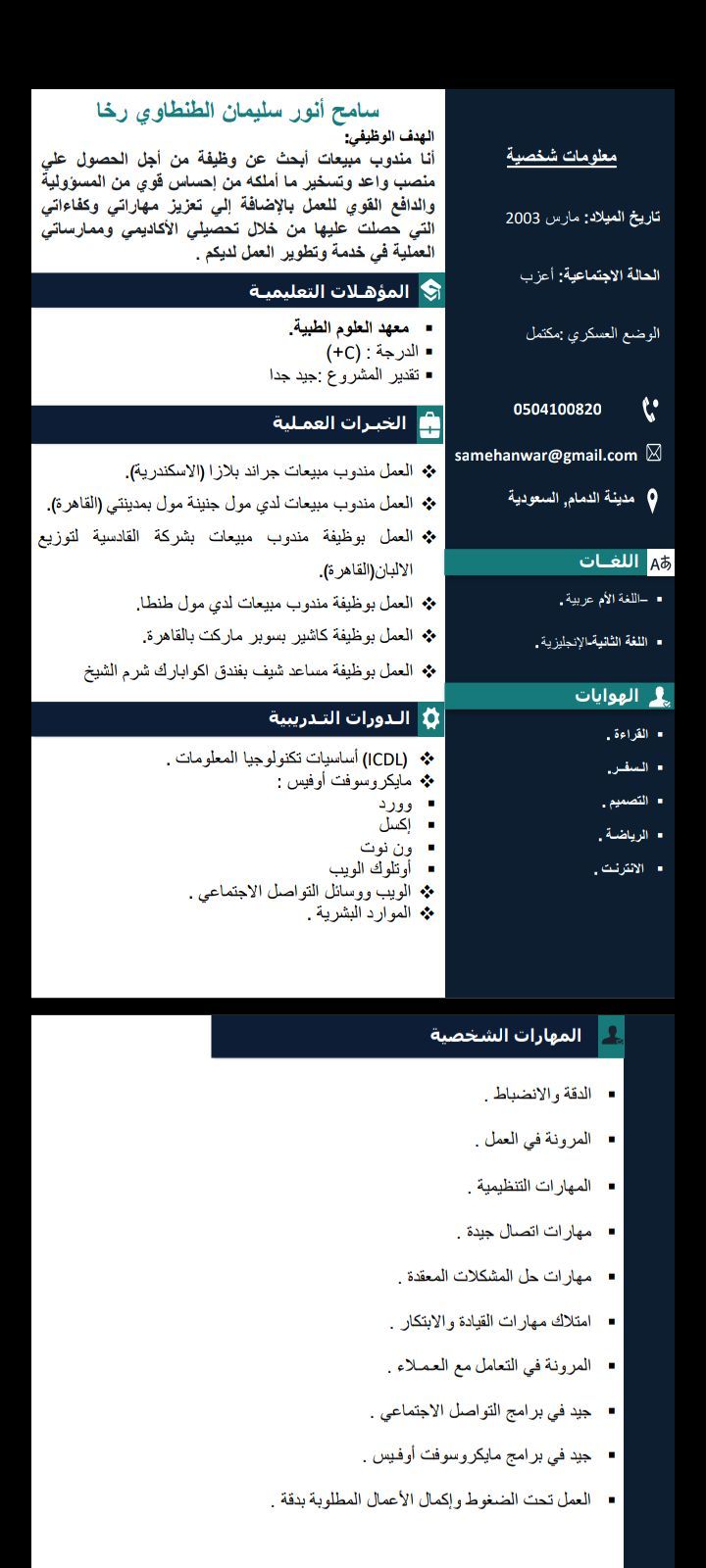 سامح من مصر خريج ثانوية أزهرية حاصل على معهد علوم طبية، لدي خبرات في مجال المطاعم والسوبر ماركات والفنادق والمستودعات والأمن. المهارات الشخصية الدقة والانضباط والمرونة في العمل، سرعة التعلم والمرونة في التعامل مع العملاء وايجاد استخدام الحاسبات متوفر للعمل حاليا وإقامة سارية المفعول أرجو التواصل للعمل. وشكرا مقدما