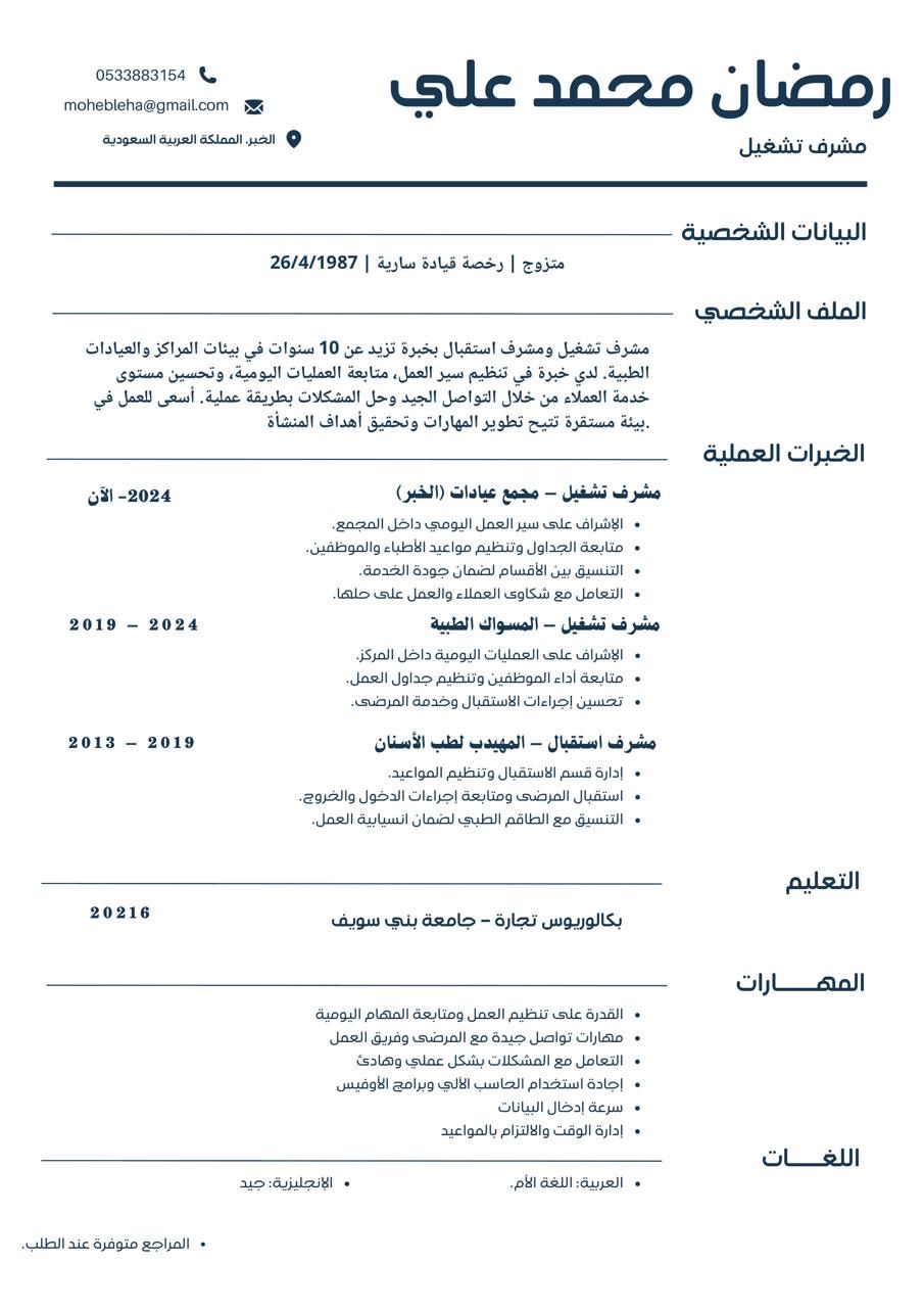 خبرة أكثر من 9 سنوات كمشرف تشغيل ومشرف استقبال وخدمة عملاء بالمجمعات الطبية، مع اتقان اصدار الفواتير وإدارة المواعيد. عملت ضمن فرق احترافية في مجموعة المهيدب لطب الأسنان ومجموعة المسواك الطبية. مشرف لمجمع عيادات بالخبر أتميز بالقيادة تنظيم العمل وتحسين تجربة العملاء، وأسعى لفرصة أضيف فيها قيمة حقيقية وأطور الأداء التشغيلي